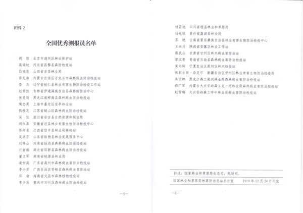 為表彰先進、激勵后進、促進工作,國家林業(yè)和草原局林草防治總站根據(jù)《 國家級林業(yè)有害生物中心測報點管理規(guī)定》,經(jīng)過各省級林業(yè)有害生物防治部門推薦和評選工作小組評選,北京市太興區(qū)國家級林業(yè)有害生物中心測報點等25個單位被評為2019年度全國先進測報點,王興興等31名 同志被評為2019年度全國優(yōu)秀測報員。